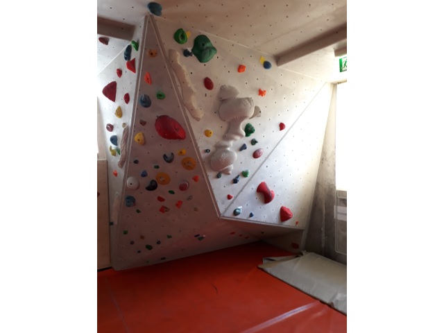 130 m2 Holzwand, 90 m2 (Höhe: 14 m) Strukturwand (Höhe: 8m), insgesamt 18 Routen zwischen 3. und 7. UIAA-Grad an 13 Linien Eigene Expressschlingen (11 Stücke) nötig! Mindestseillänge: 45 m!